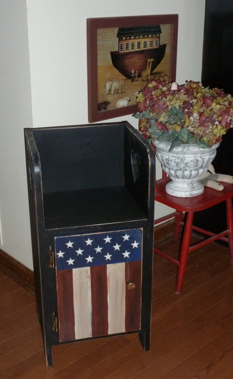 This little cupboard is one I have had for several years and never knew what to do with it because of the heart cut-outs on the sides. Heart cut-outs on furniture were popular in the 70's, 80's and the 90's but you don't see much with hearts anymore. I however say what was once desirable will be again. I decided to paint the cupboard with a patriotic theme, because our Patriotism is the heart of this county and BA-zing there it is hearts rule!